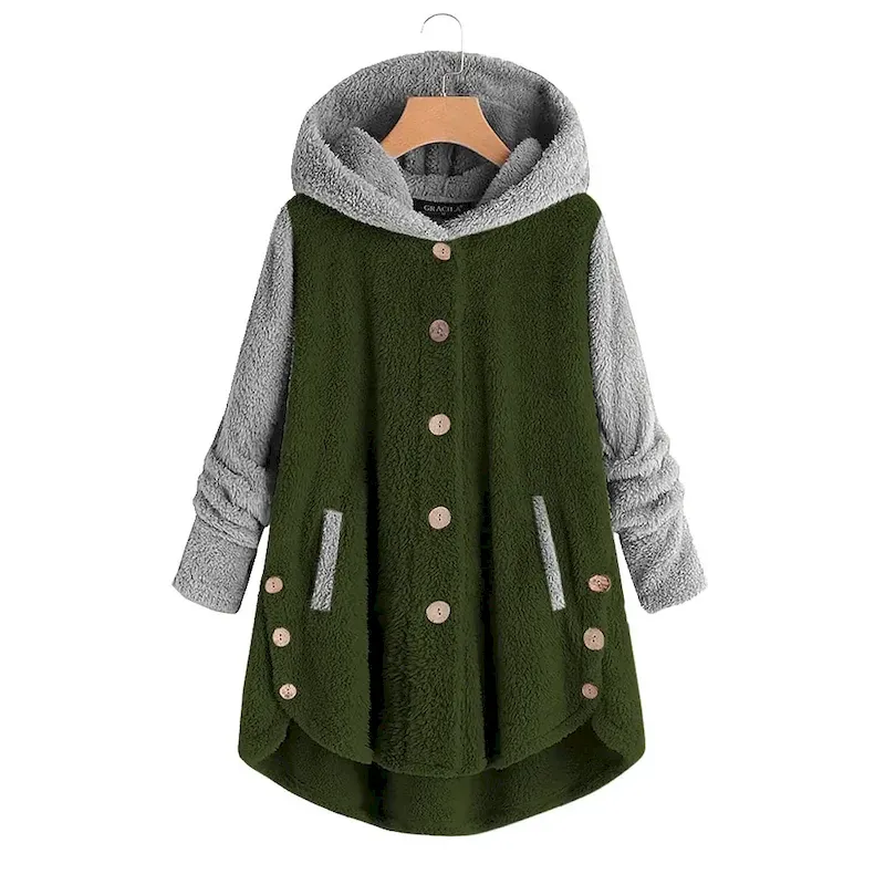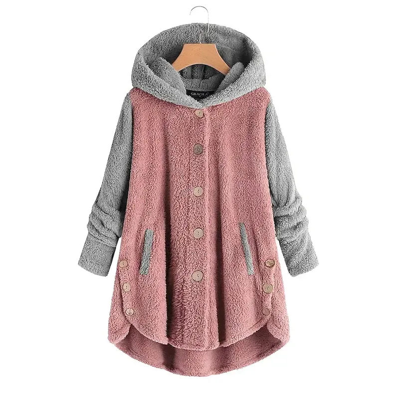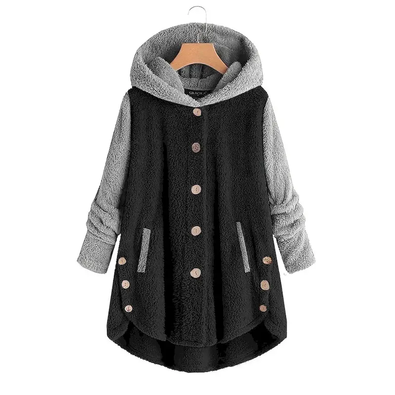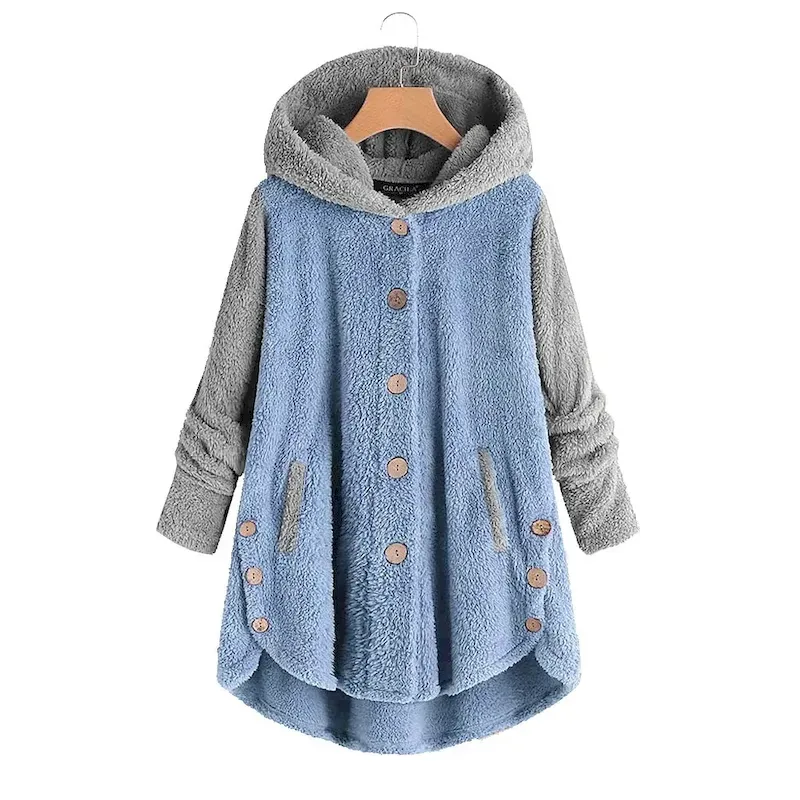 [Fabric]: Crafted from a cozy combination of fleece, flannel, and sherpa, this women’s jacket offers a soft, fuzzy texture that is perfect for the colder months. The micro-elasticity ensures a comfortable fit while retaining warmth, making it an ideal choice for both fall and winter.[Silhouette]: Designed with a regular fit, this jacket features a long-fitted style that provides a flattering silhouette for all body types. The slightly extended hem at the back adds a subtle touch of elegance.[Design Highlights]: The jacket boasts a unique color block design with a stylish hood and two-tone contrast between the soothing blue main body and the sleek grey sleeves and hood. The classic button-down front is enhanced with wooden buttons, which impart a rustic charm. Additionally, it includes two handy front pockets, perfect for keeping your essentials accessible and your hands warm.[Occasions]: This casual jacket is ideal for street and casual scenarios, providing both warmth and style. Whether you’re heading out for a casual walk or layering up for a chilly day, this jacket’s trendy aesthetic ensures you look chic and feel comfortable.[Size Range]: Available in a wide range of sizes from S to 5XL, this jacket caters to diverse body shapes and preferences, ensuring everyone can find their perfect fit.OK