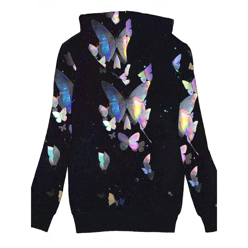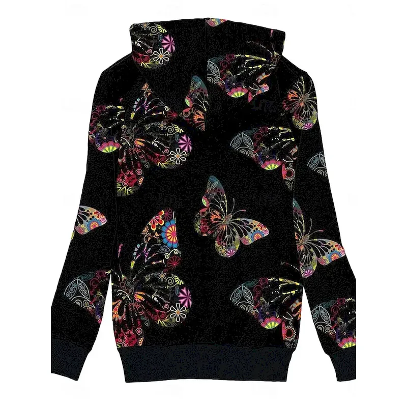[Fabric]: Crafted from high-quality polyester, this women’s hoodie jacket features a micro-elasticity that offers both comfort and durability. The fleece lining provides exceptional warmth, making it perfect for colder months. [Fit]: This hoodie jacket comes in a regular fit, ensuring a relaxed and comfortable feel. The ribbed cuffs and hem enhance the snug fit, allowing for ease of movement and effortless layering over additional clothing. [Design Highlights]: The outerwear boasts an eye-catching butterfly print, delivering a unique and vibrant fashion statement. A full-length zipper and spacious hood offer functionality and added protection against cold weather. Practical pockets add convenience for daily use. [Occasions]: Suitable for various settings such as daily wear, vacations, and street outings. This hoodie jacket is perfect for those looking to stay warm and stylish while going out or enjoying relaxed activities in cooler weather. [Size Range]: Available in sizes S through 2XL, this jacket caters to a range of body types, ensuring a comfortable fit for everyone.OK
