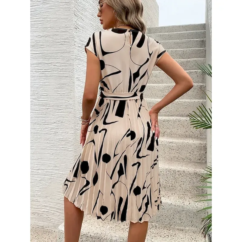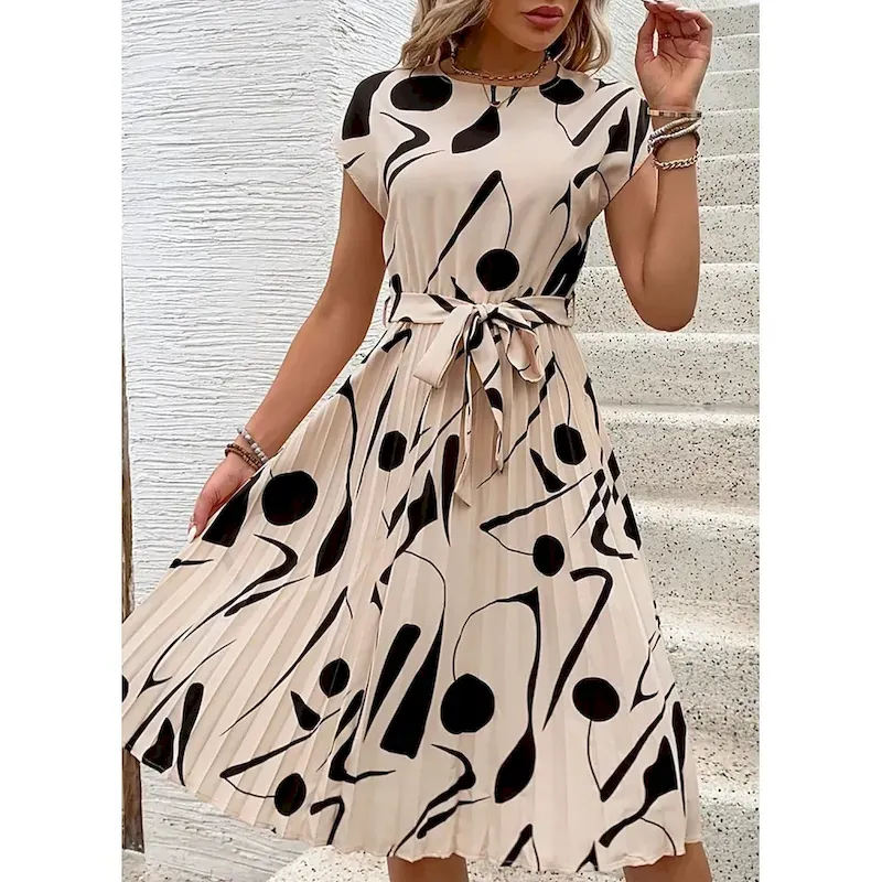 – Beautiful pleated design- Eye-catching print design- Classic and flattering crew neck neckline
