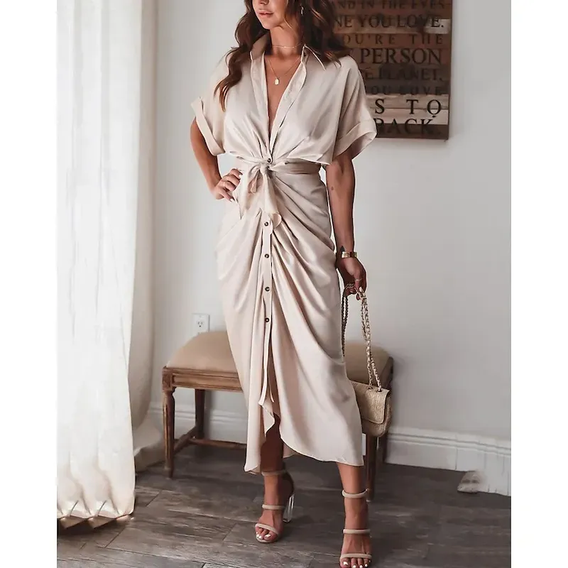 – Perfect for spring and summer- Made from comfortable polyester fabric- Features short sleeves for a feminine look- Designed for stylish and casual wear- Suitable for various occasions such as dates, vacations, and daily wear- Shirt and casual dress styles available- Trendy button design and lapel neckline