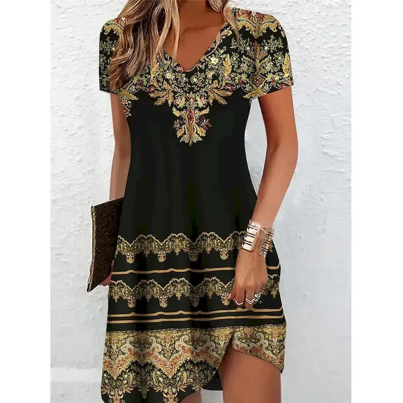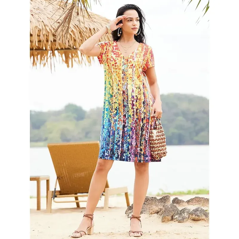 [Fit]: Designed with a regular fit, this dress offers a relaxed silhouette that is both comfortable and stylish. Its short sleeves and V-neckline contribute to a casual yet elegant look suitable for a variety of occasions.