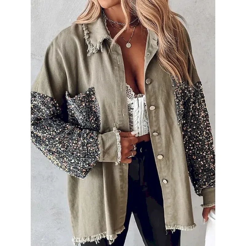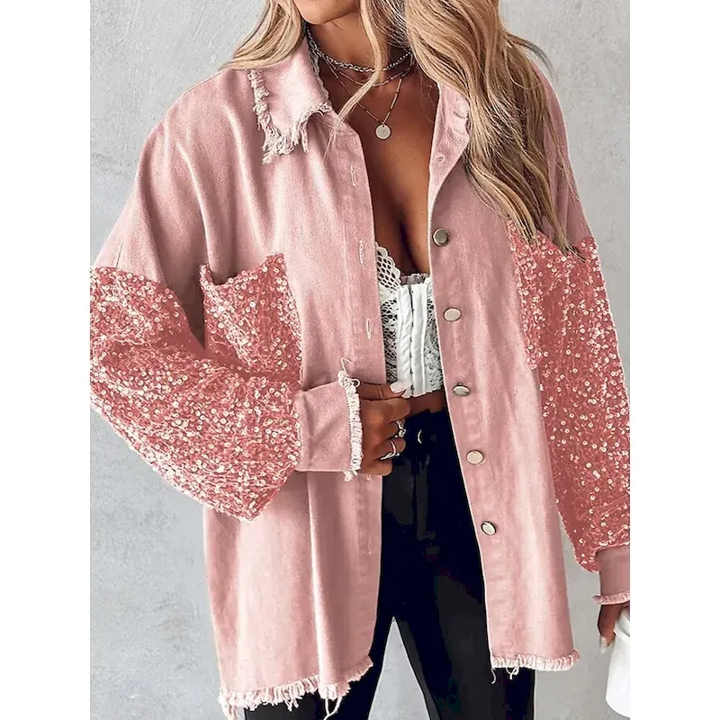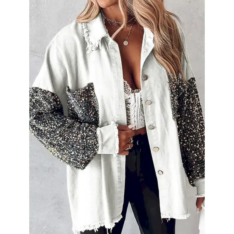 Women’s Shirt Jacket Casual Jacket Breathable Comfortable Pocket Sequin Casual Plain Vacation Street Casual Daily Wear Single Breasted Regular Lapel Regular Fit Long Sleeve Outerwear Light Blue White