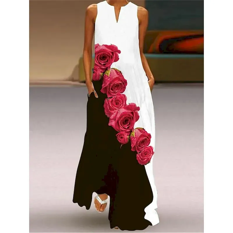[Silhouette:] Designed in a sleeveless style with a slight V-neck, this dress combines elegance with comfort. Its regular fit and flowing silhouette make it ideal for warm weather, offering a relaxed yet stylish look.